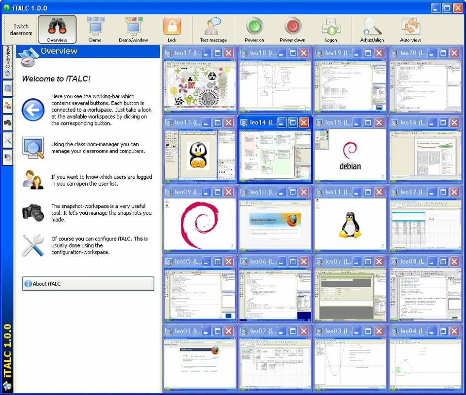 iTALC is a remote control system oriented towards computer workshops in schools that teachers can use to monitor the work of their students while they explain the lessons.