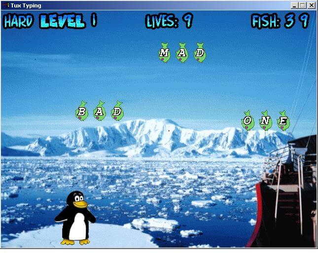 In the first game, fish fall from the sky. Each fish has a letter or a word written on it. When the player presses the matching key, or types the correct word, Tux will locate himself at the bottom of the screen ready to eat the fish. If fish still have letters in when Tux swallows them, then his belly gets sore and the player loses a life. The second game is similar, but the aim is to stop comets from dropping in a city.